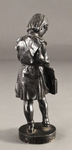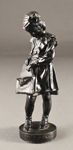 Изображена фигура маленькой девочки на небольшой подставке. Девочка облачена в школьную форму и ищет что-то в портфеле. Статуэтка богата красивыми сочетаниями отчеканенных складок на платье и волос девочки.