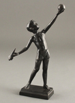 На прямоугольной двухступенчатой подставке изображена фигура стоящего мальчика в трусах. В поднятой вверх левой руке он держит шар, а в правой, опущенной вниз, — модель ракеты. Тонкие части тела мальчика отвлекают от него самого и подчёркивают важность не его личности, а его увлечения.