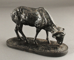 На овальной подставке изображён стоящий баран, щиплющий траву. Трава выполнена в виде чеканки на подставке, на которой стоит баран. Шерсть барана очень сильно отчеканена.