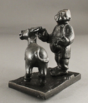 На подставке изображены мужчина невысокого роста и осёл. Мужчина улыбается, вытянув руки. Осёл тоже улыбается, отведя голову в сторону от мужчины. Седло на осле и халат мужчины имеют схожий геометрический рисунок.